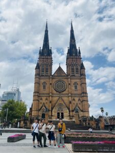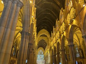 オーストラリア最大級の教会で、その美しさから「シドニーの宝石」とも称されています。巨大な2本の尖塔は、教会のシドニー象徴で、中に入ると、高い天井と細長い柱が作り出す開放感に圧倒されます。現在の大聖堂は「2代目」で、初代の大聖堂が火災で全焼した後、132年もの歳月を費やし、まさに世代を超えて造り上げられた祈りの場です。