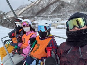 2班はホテル前で数回昨日の復習をした後、初めてのリフトに。ドキドキしながら上がっていきましたが、降りてくる頃にはターンもしながら少しトレインっぽく、並んで降りて来られるようになって来ました。