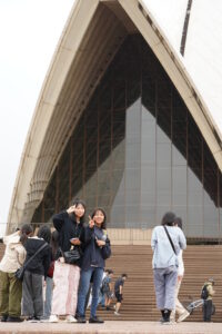 最大の特徴は、いくつもの白い帆が重なり合ったような独特な屋根で、105万枚以上のタイルが敷き詰められており、全てを繋ぎ合わせると球体になるそうです。残念ながら今日は小雨が降っていましたが、生徒たちはお気に入りの角度から写真を撮っていました。