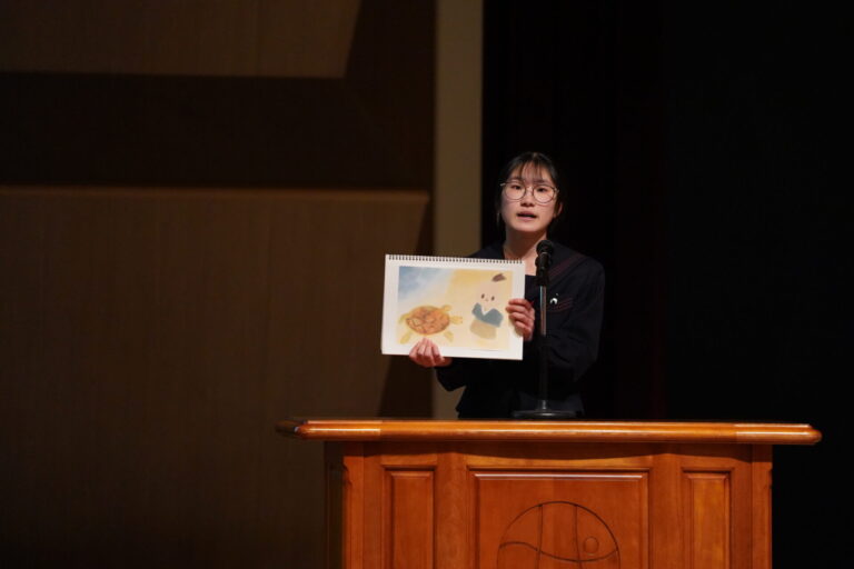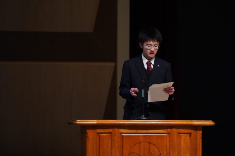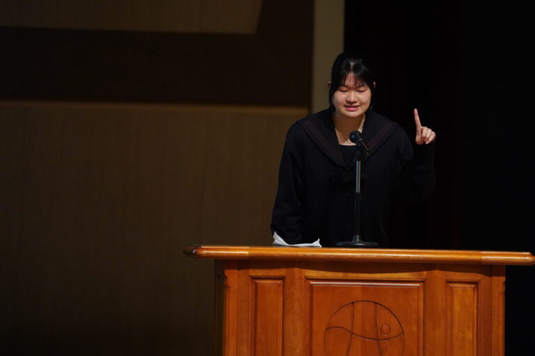 毎年、1年間の英語学習の集大成として行われており、予選(生徒全員が行なう授業内での発表)を勝ち抜いたファイナリストたちが、コンテストでの優勝のため、放課後やお昼休みを活用して何度も練習に取り組んできました。英語科教員に今年度の卒業生2名を加えた審査員が、英語力、表現力の他、発表にかける情熱を審査し、優勝者を決めます。