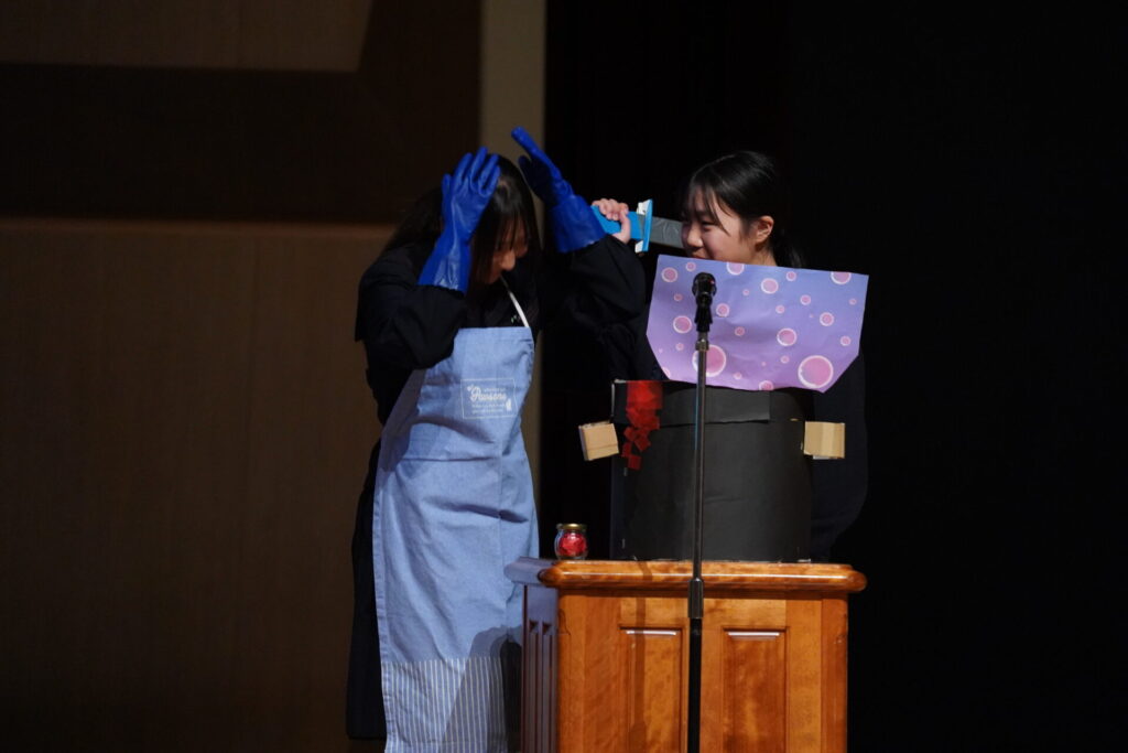 小道具を使ったり、台詞に合わせて声音を変えたりしながら、オリジナルの台本で短いシチュエーションを演じました。