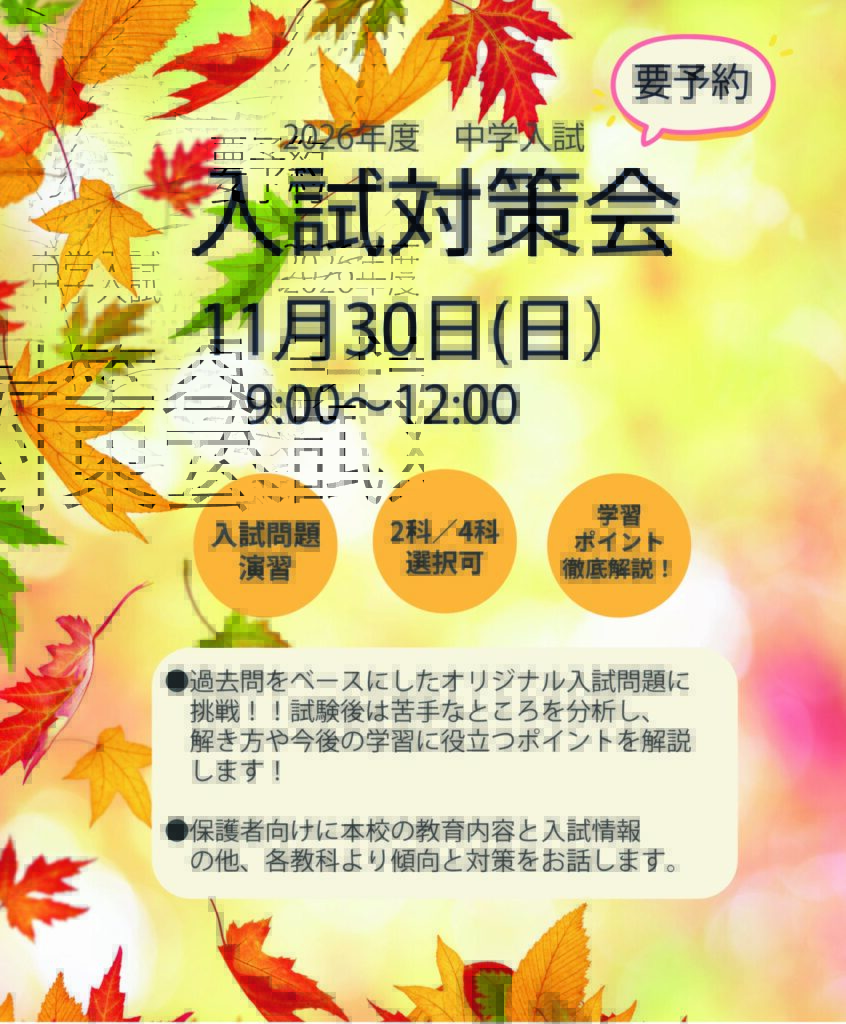 《保護者対象説明会同時開催》 本校の教育内容、2026年度入試情報に加え、 4科(国・算・社・理)各教科より、入試の傾向と対策について詳しくご説明いたします。