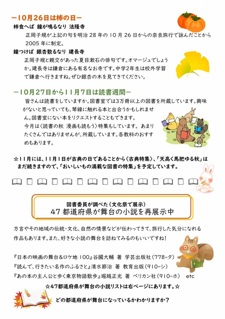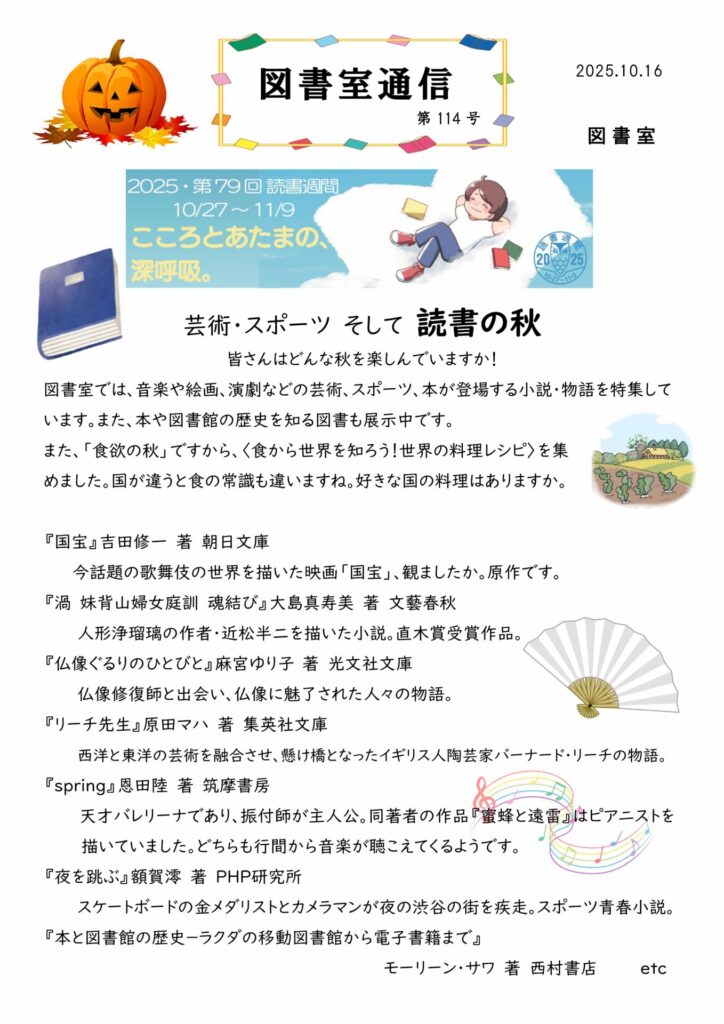 図書室から毎月1回生徒向けに発行しています。新着図書や図書室で行っている特集や企画、おすすめの図書などをご案内しています。図書室は生徒だけではなく、保護者の方もご利用いただけます。ぜひご活用ください。