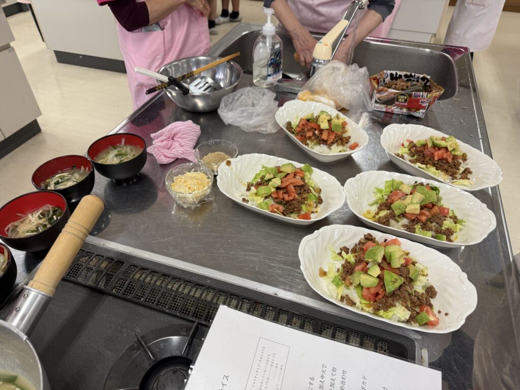 食物班では、テーマを設けてメニューを考えることはあるものの、栄養バランスを意識した食事をテーマとすることは初の取り組みでした。数種類の野菜を扱う、合わせ出汁を取るなど細かな調理の技術を学ぶことができました。味噌汁は塩分計で塩分濃度を測り、家の味噌汁との味の違いを知りました。タコライスと味噌汁はいずれも野菜たっぷりで、満足感の高いメニューでした。