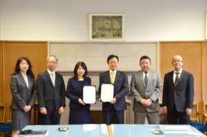 広尾の、聖心女子大学キャンパスにおいて、締結式が挙行され、安達まみ学長、土田宏成副学長、土肥久美子アドミッションズオフィス次長、本校からは、永川尚文理事長・校長、佐藤康副校長・入試広報部長、三田村豊史進路指導主任が列席、なごやかな雰囲気のもと、協定書を取り交わしました。