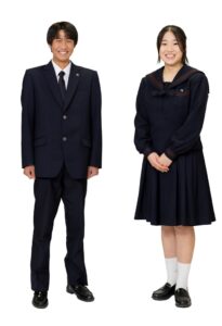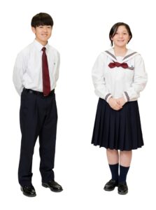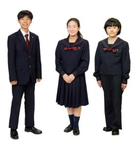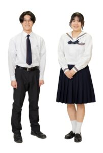 男子はブレザー、女子はセーラー服で、男女とも紺色を基調とし、アクセントにスクールカラーのえんじ色を施しています。1950年に制定された女子の制服のネクタイが共布なのは、制服をつくるときにできる端切れの共布を胸元に結んだのが始まりで、今も受け継がれるエコ精神の表れです。男子の制服は、上品で落ち着きのあるブレザースタイル。夏服のスラックスの色は、えんじ色の格子柄がさりげなく入った清新なグレイです。同じ生地で作られた女子の夏用替えスカートも好評です。ネクタイの色は男女とも中学生がえんじ、高校生が紺です。